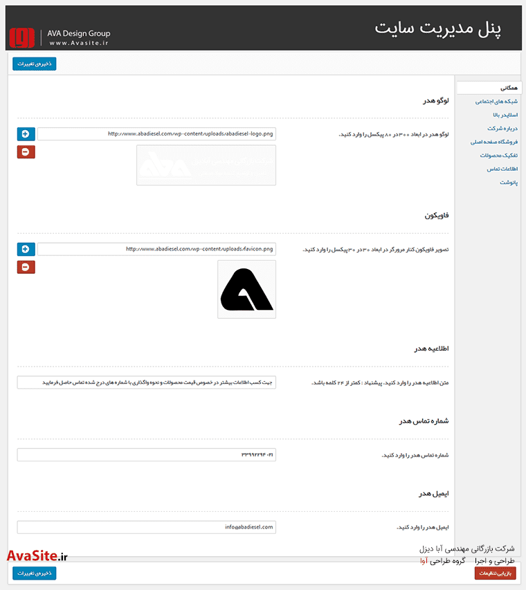 ویژگی های طراحی سایت شرکت آبا دیزل